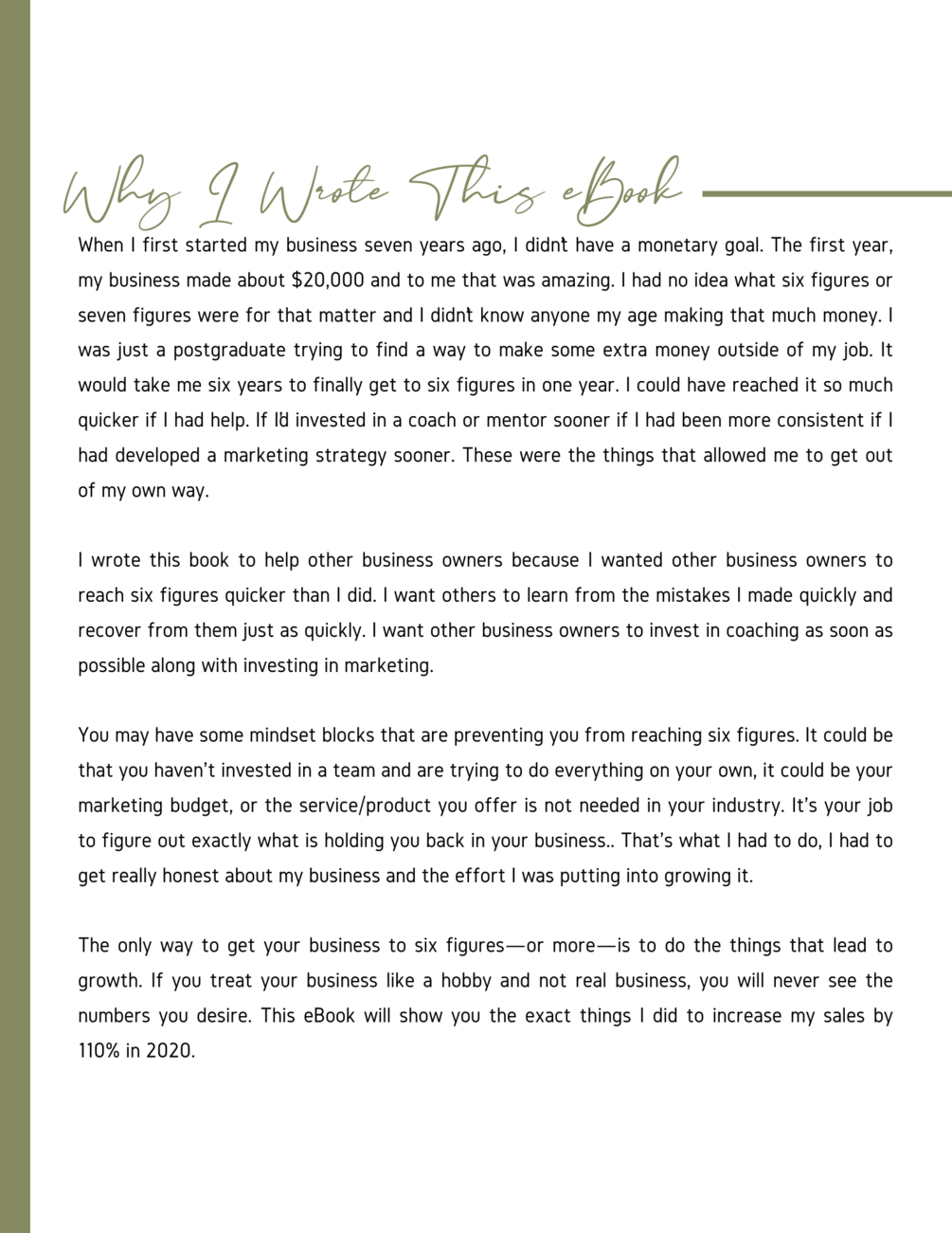 "The Six Figure Year" eBook provides a straightforward account of how I achieved a yearly income of over $100,000 through my business.